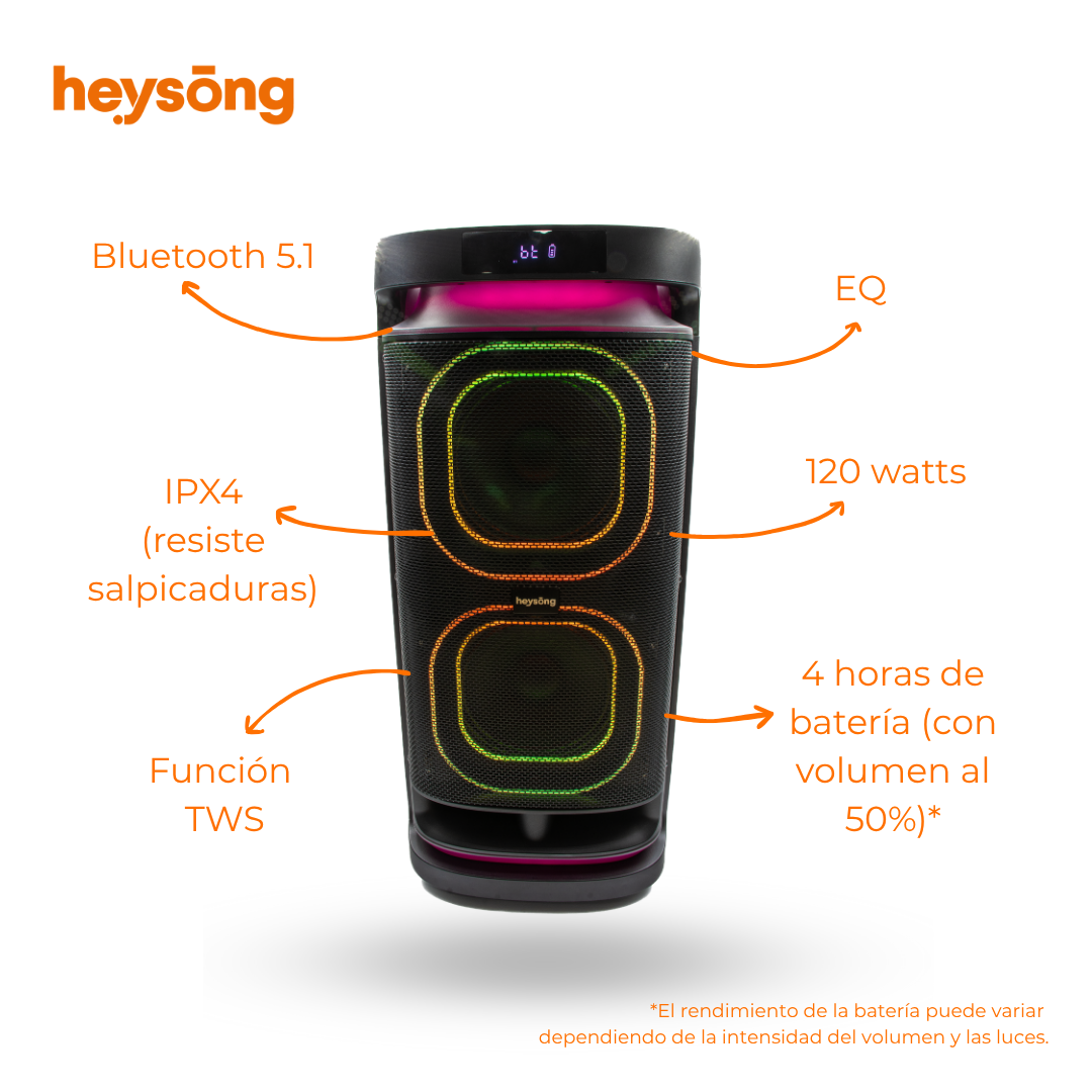 La Heysong Fiesta es una partybox de gran tamaño que ofrece un sonido potente, graves profundos y luces LED dinámicas para animar cualquier evento. Con conectividad Bluetooth, resistencia al agua y batería de larga duración, es ideal para fiestas tanto en interiores como exteriores. ¡Haz de cada celebración una experiencia inolvidable con la Heysong Fiesta!